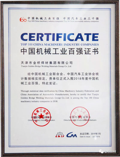 金橋焊材集團(tuán)榮獲2018年中國機(jī)械工業(yè)百強(qiáng)企業(yè)稱號(hào)