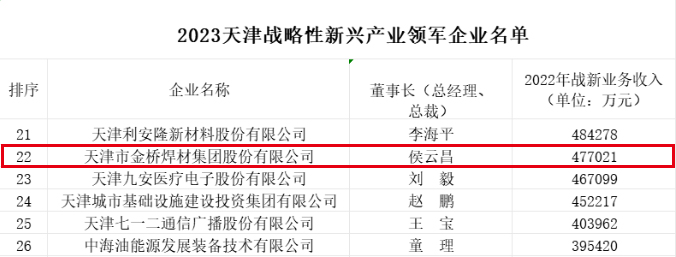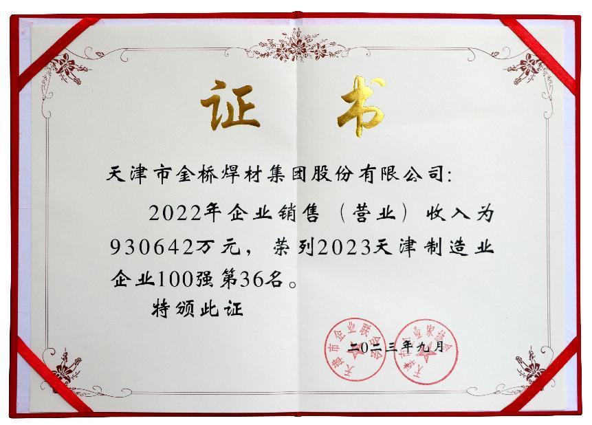 2023年,金橋焊材集團(tuán)守正創(chuàng)新,拼搏進(jìn)取,高質(zhì)量發(fā)展態(tài)勢(shì)持續(xù)向好,再次入選天津企業(yè)100強(qiáng)(86名)和天津制造業(yè)100強(qiáng)(36名),天津戰(zhàn)略性新興產(chǎn)業(yè)領(lǐng)軍企業(yè)22名。